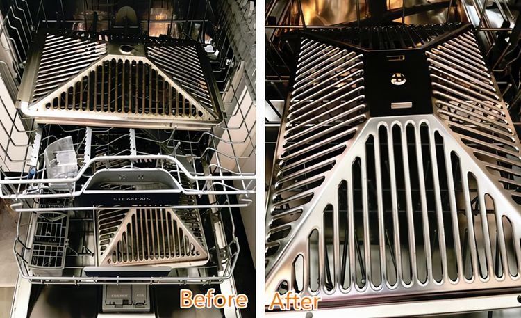 而且它还能清洗烟机滤网,同样洗得很干净,再也不用对着烟机的重油污感到无从下手了!