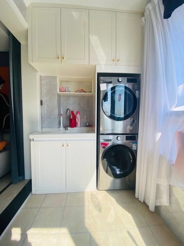 而且还解放了阳台,再也不用每天一开门就看到阳台上晾的花花绿绿的衣服碍眼了,只需要在阳台一边装个简易晾衣杆就行。阳台还能变成一个舒适的休闲空间,现在房子这么贵,节省出来的空间都是钱啊!