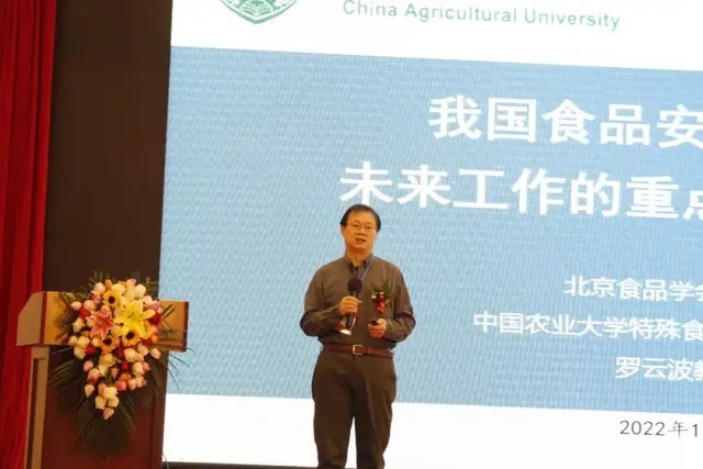 △北京食品学会理事长、中国农业大学特殊食品研究中心主任罗云波教授以《我国食品安全现状和未来工作的重点安排及建议》为题进行演讲