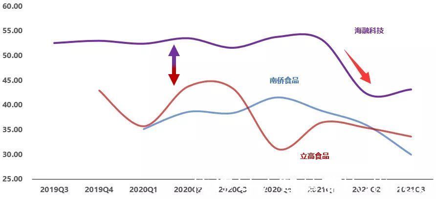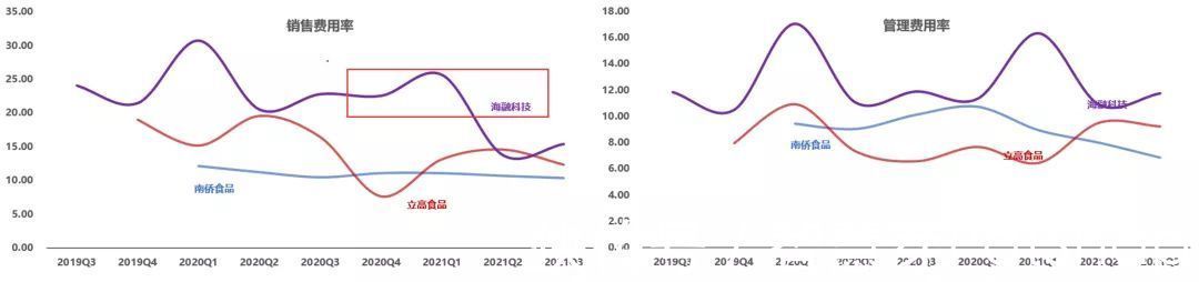 图:毛利率(单位:%)来源:塔坚研究 海融科技毛利率远高于南侨食品和立高食品:海融科技产品以奶油为主,对比三家厂商的奶油产品,海融科技的奶油产品毛利率同样大幅领先,公司表示主要是原材料、生产工艺、产品系列等存在差异所致。 立高食品2020Q4、海融科技2021Q2毛利率大幅下滑,均是新收入准则下,运输费用调整至营业成本所致。 四、期间费用率