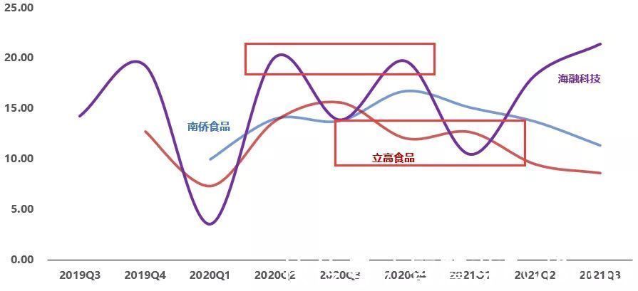 图:杜邦分解(单位:%、次)来源:塔坚研究 立高食品净资产收益率领先,主要是总资产周转率、权益乘数较高,其中: 立高总资产周转率较高,主要来自较高的存货周转效率。南侨股份、海融科技的烘焙油脂产品保质期较长,适合大规模提前生产,存货周转率较小。南侨食品直营客户的占比较高,结算账期较长,应收账款周转率略低于同行业厂商。 海融科技2020年11月募集资金到账,导致总资产周转率下滑。 以上,基本数据情况分析清楚后,我们来看行业情况。