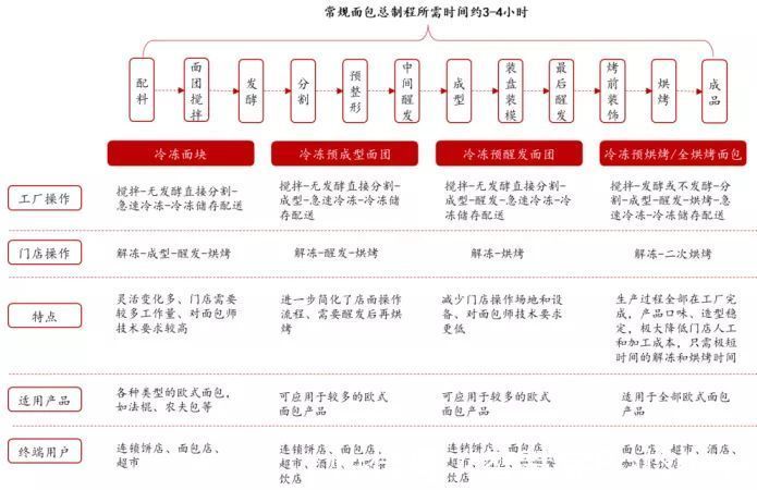 材料成本占比80%,人工占比5%,制造费用占比15%。 以面包为例,日常面包制作流程,包括打面、基础发酵、分割、揉圆、松弛、整形、醒发,烘烤等——至少要用三四个小时的时间等待面团加工、醒发、出炉。 而冷冻面团,就是在其中某个环节中止流程,把面团进行急速冷冻后,在-18°C的环境下保存,然后在需要的时候通过解冻和烘烤等简单工序加工成面包,使得面包制作过程更灵活方便和可控。
